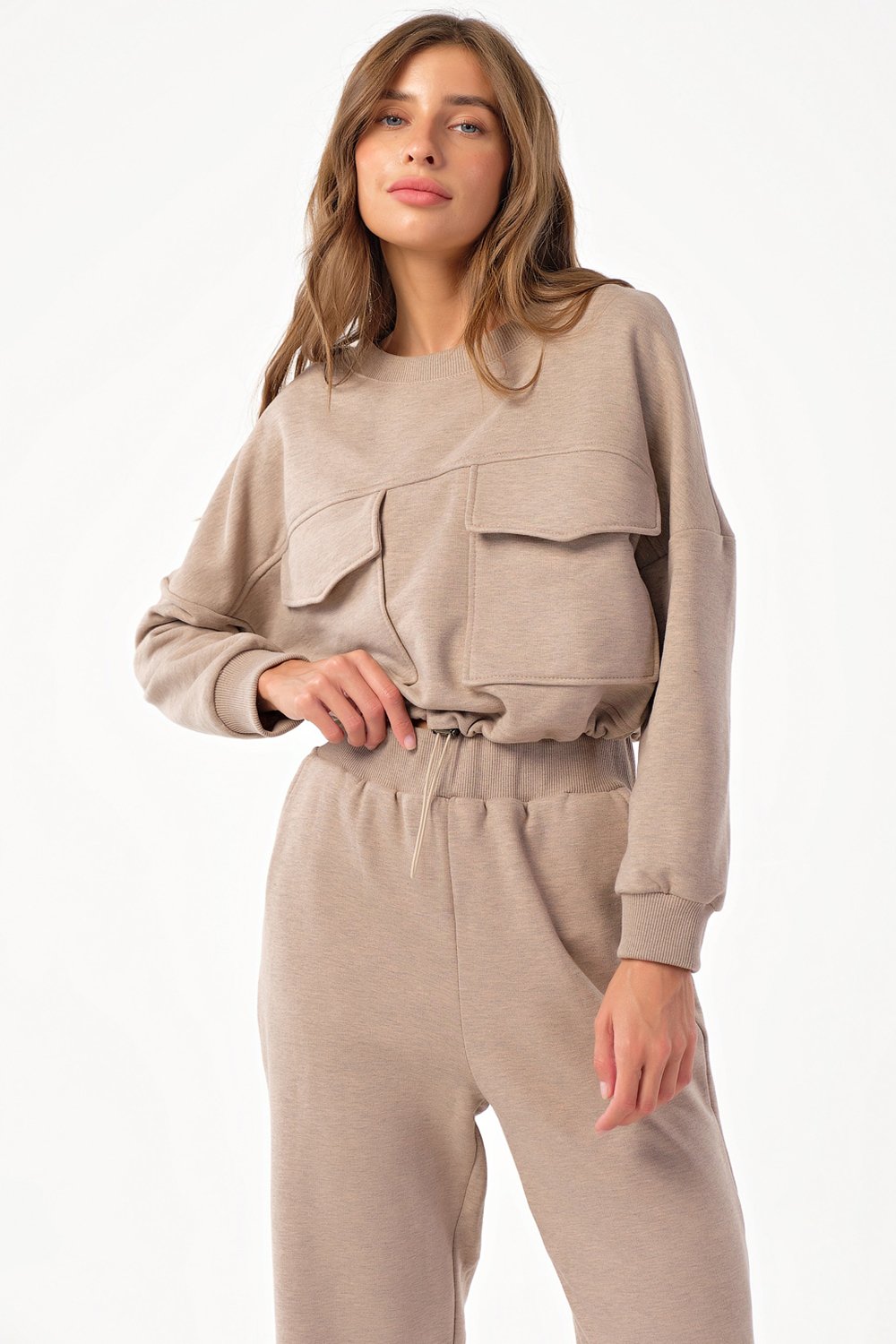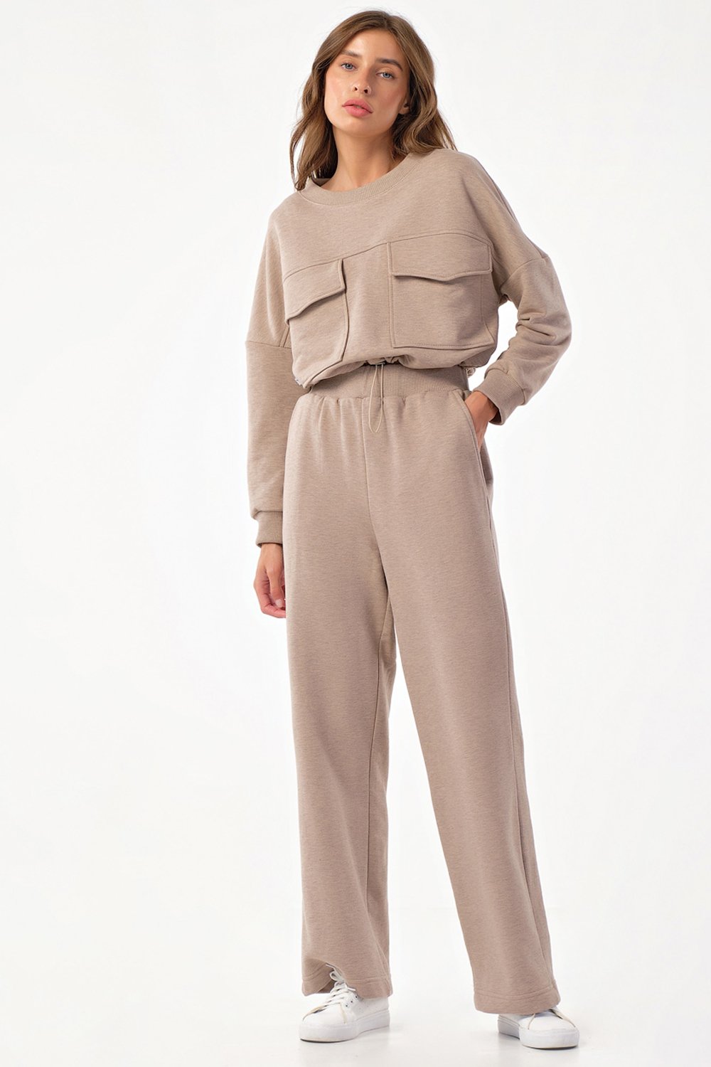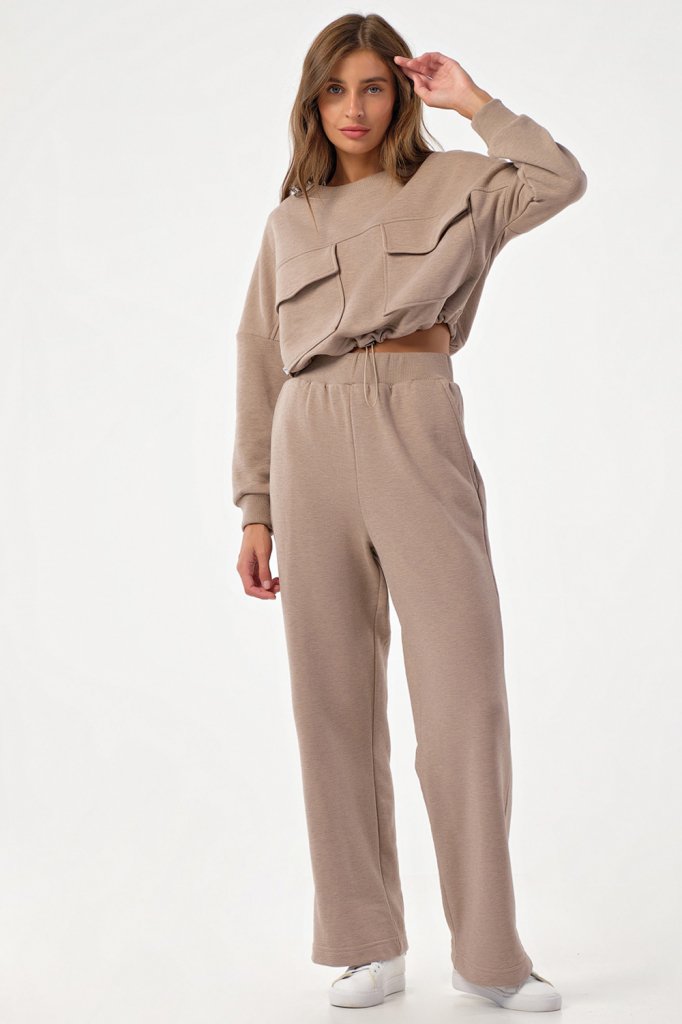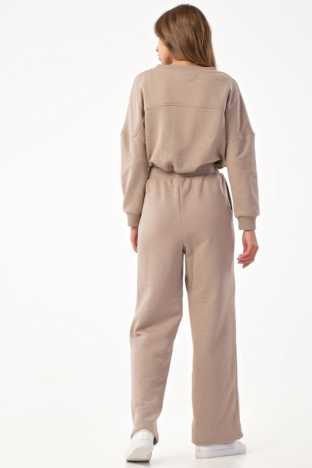 • Особенности: Костюм из свитшота и брюк из футера. Детали свитшота: свободный силуэт, горловина обработана бейкой из кашкорсе, спущенная линия плеча, рукав с притачной манжетой из кашкорсе, кокетка по переду, накладные карманы с клапанами, по низу свитшота кулиска с резинкой с регулировкой фиксатором. Детали брюк: прямой силуэт, притачной пояс из кашкорсе с резиной, боковые карманы.