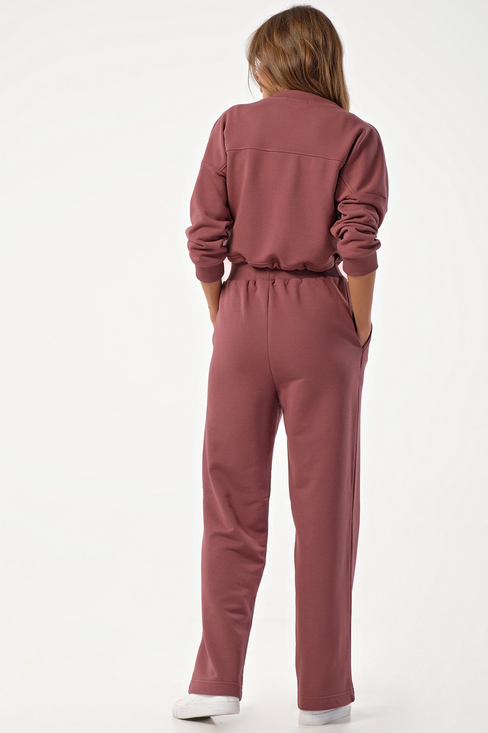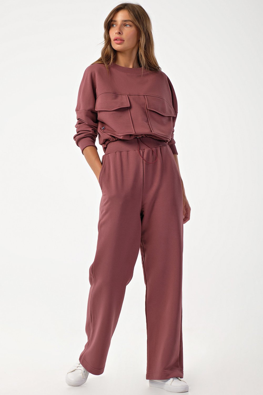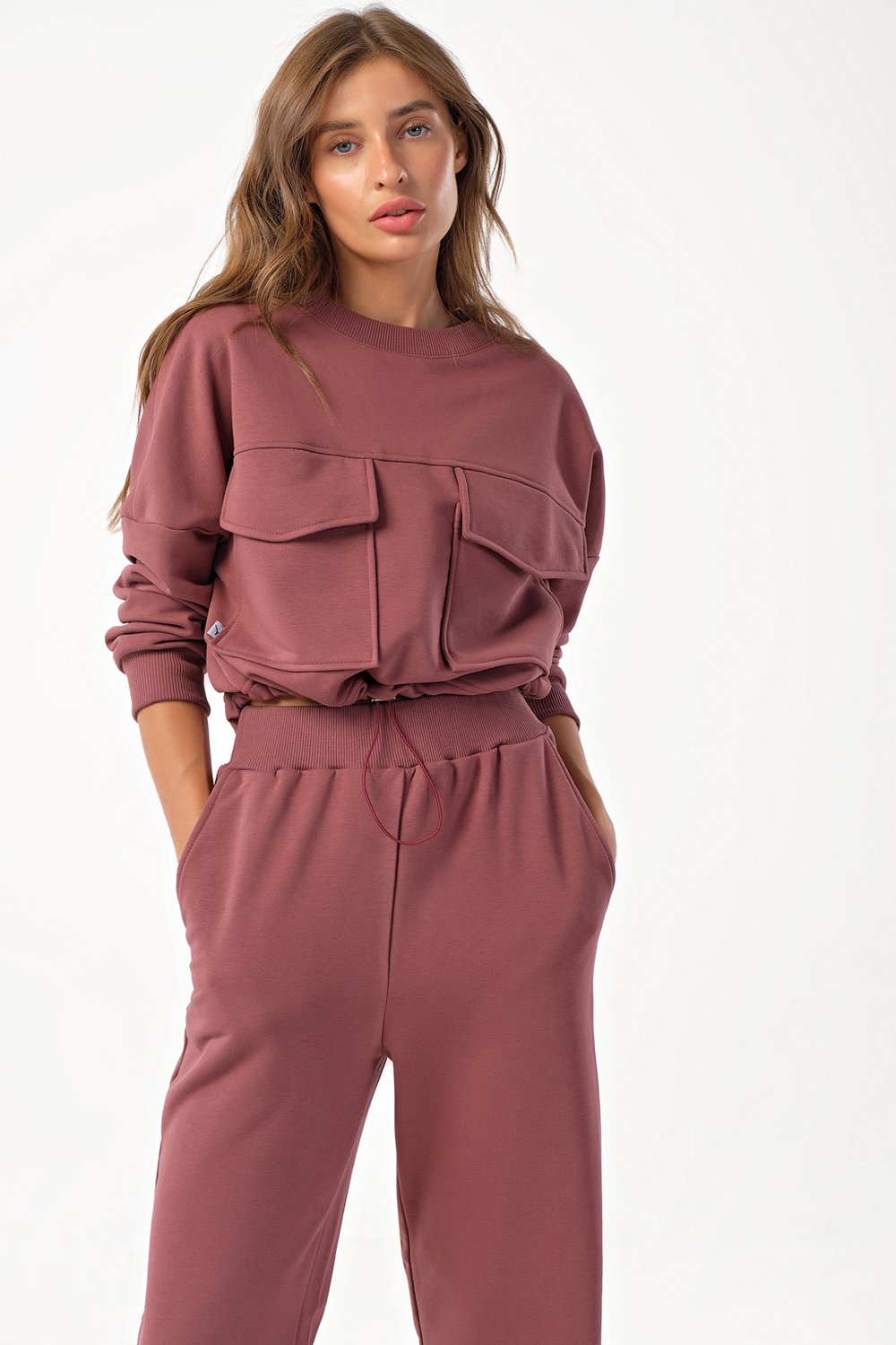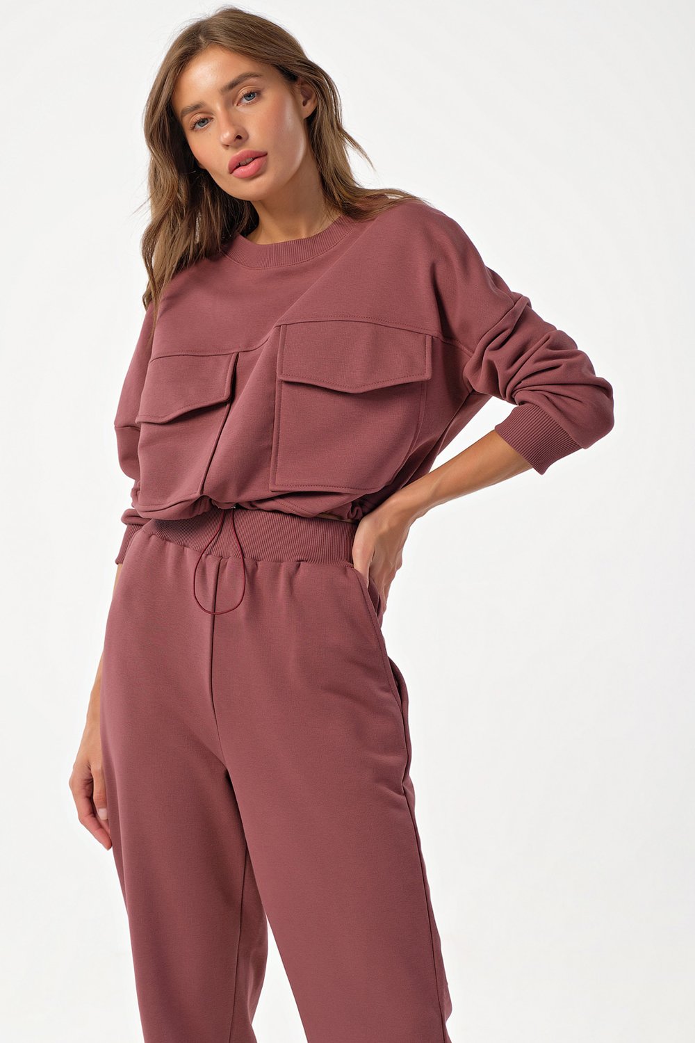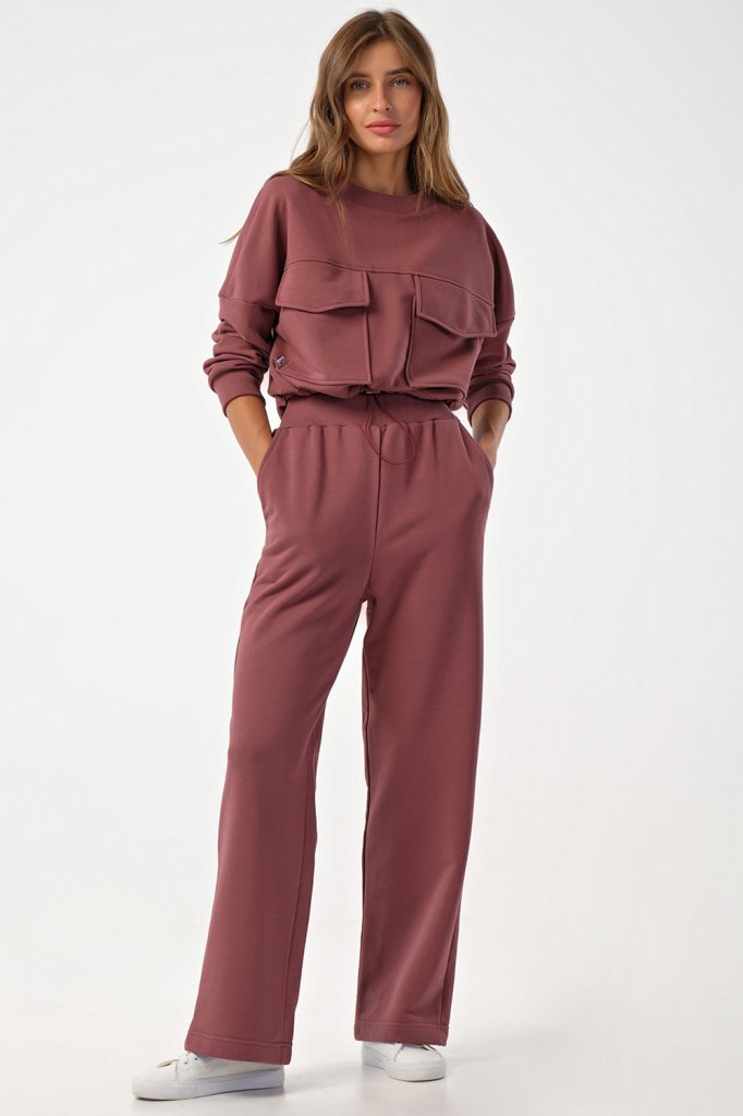 • Особенности: Костюм из свитшота и брюк из футера. Детали свитшота: свободный силуэт горловина обработана бейкой из кашкорсе спущенная линия плеча рукав с притачной манжетой из кашкорсе кокетка по переду накладные карманы с клапанами по низу свитшота кулиска с резинкой с регулировкой фиксатором. Детали брюк: прямой силуэт притачной пояс из кашкорсе с резиной боковые карманы.