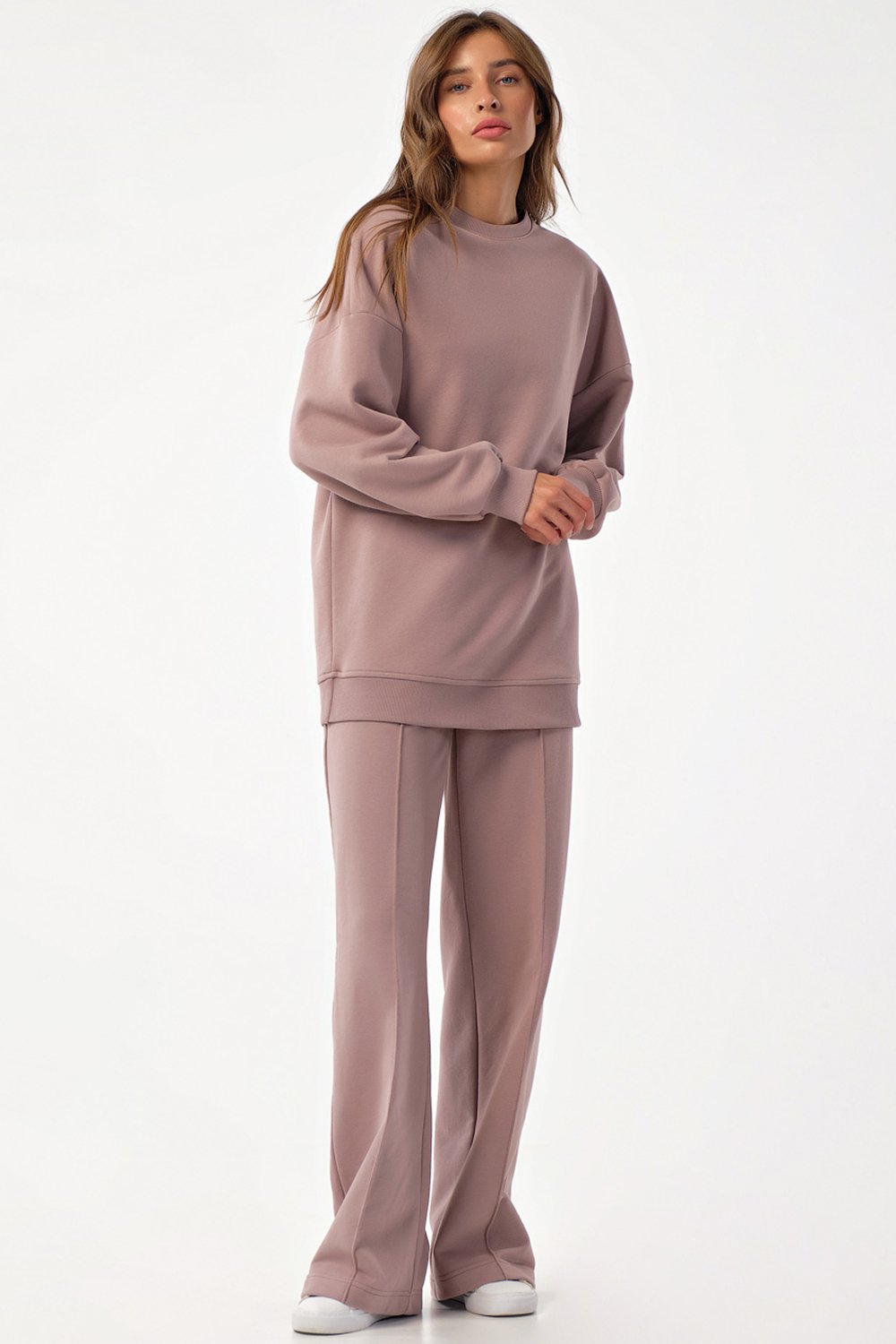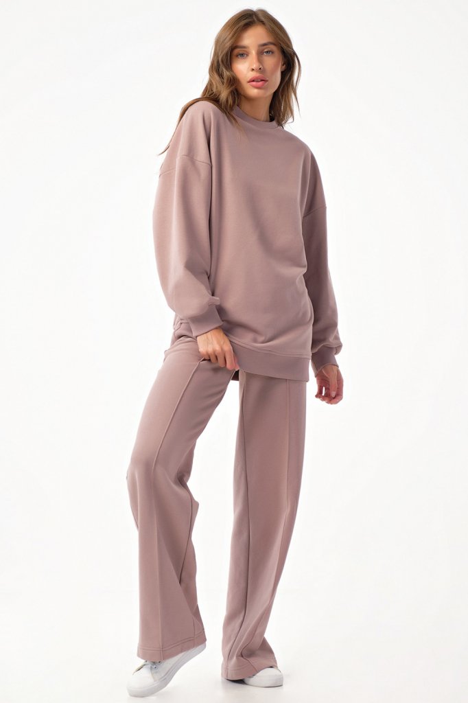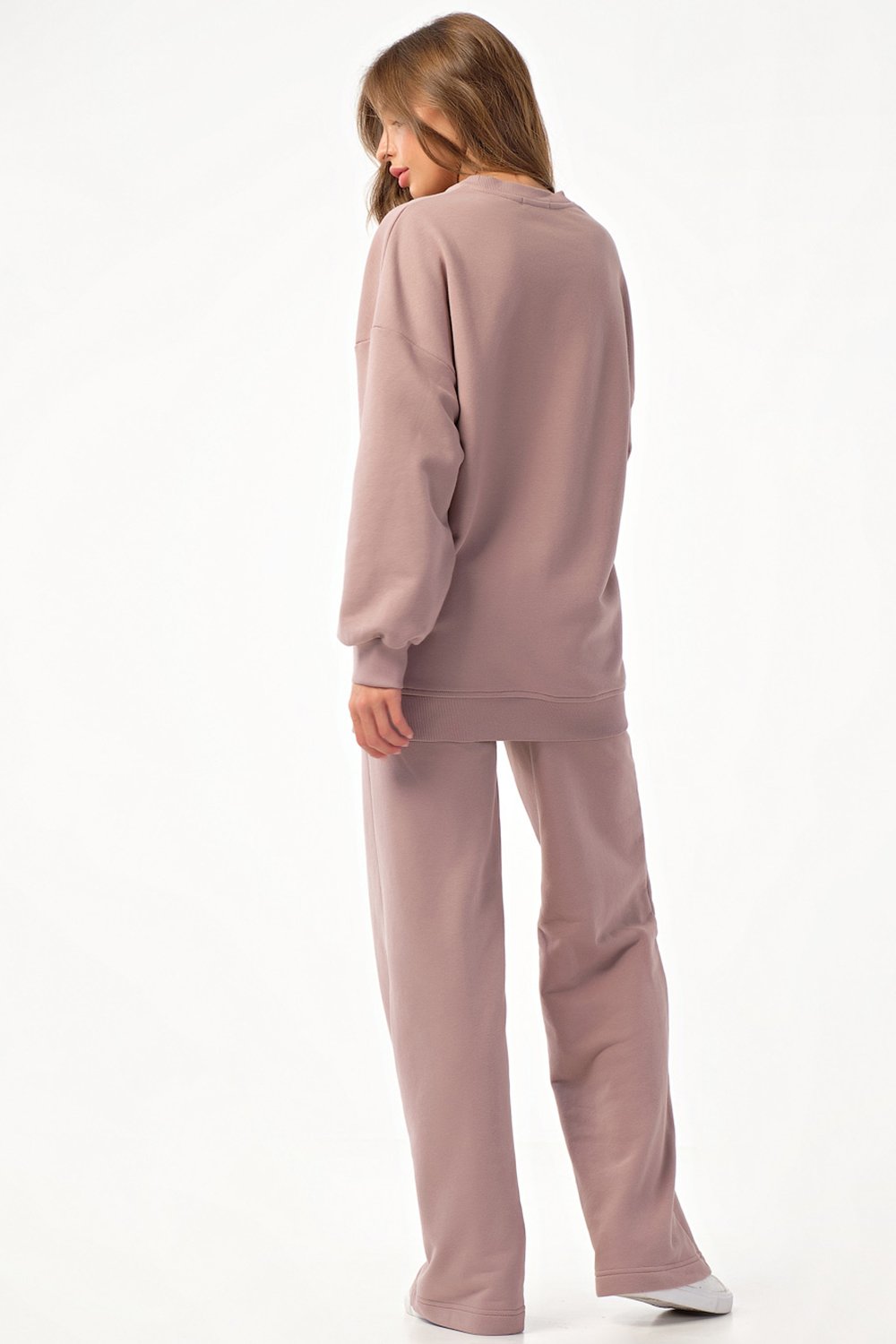 • Особенности: Костюм из свитшота и брюк из футера. Детали свитшота: свободный силуэт, горловина с бейкой из кашкорсе, спущенная линия плеча, широкий рукав с притачной манжетой из кашкорсе по низу, притачная планка из кашкорсе. Детали брюк: прямой силуэт, притачной пояс из кашкорсе с резиной, застроченные стрелки по переду.