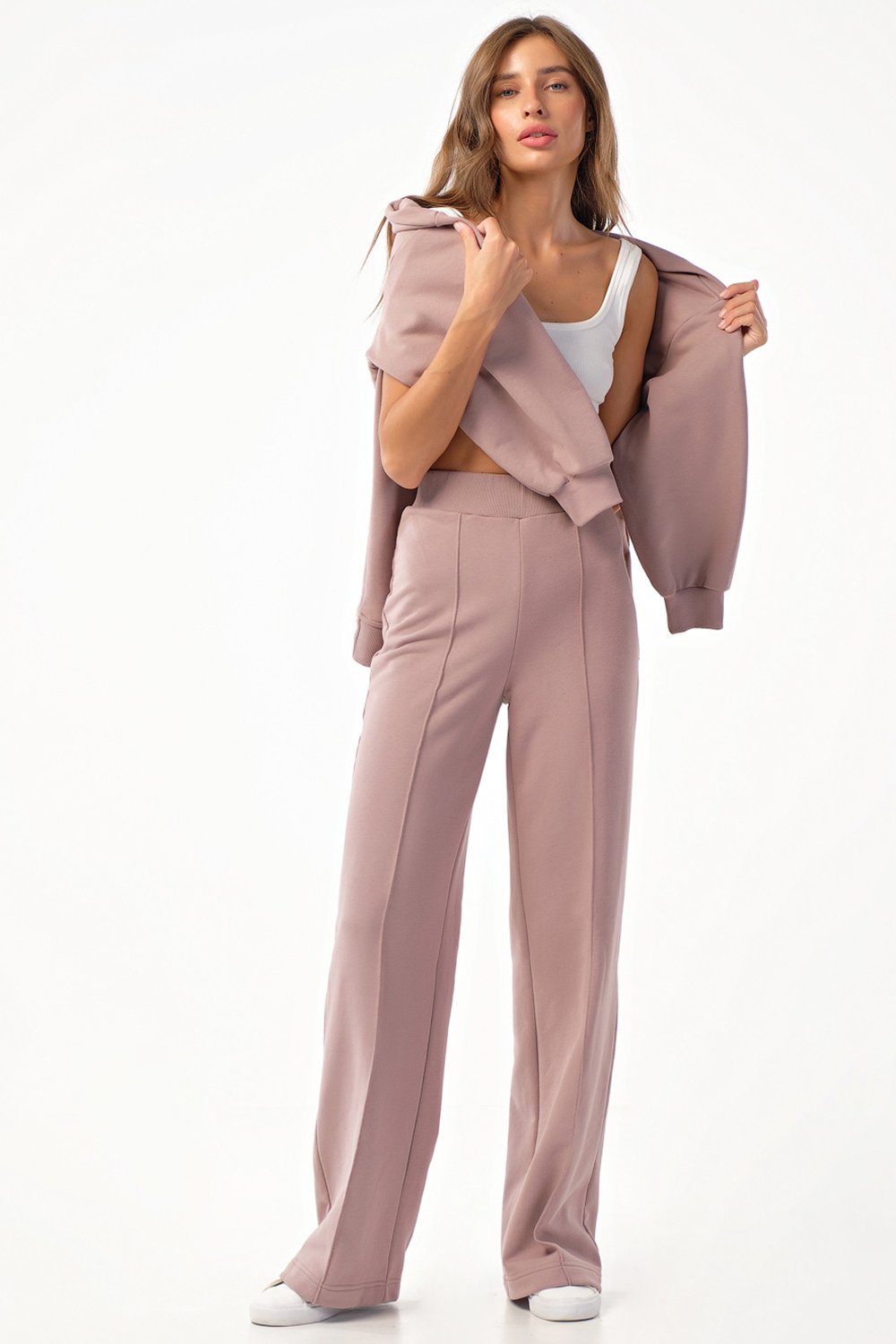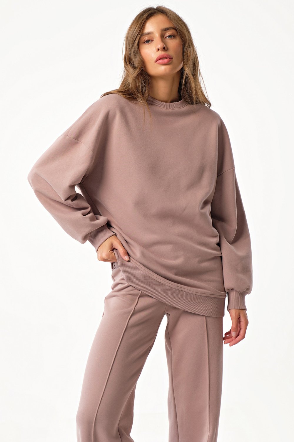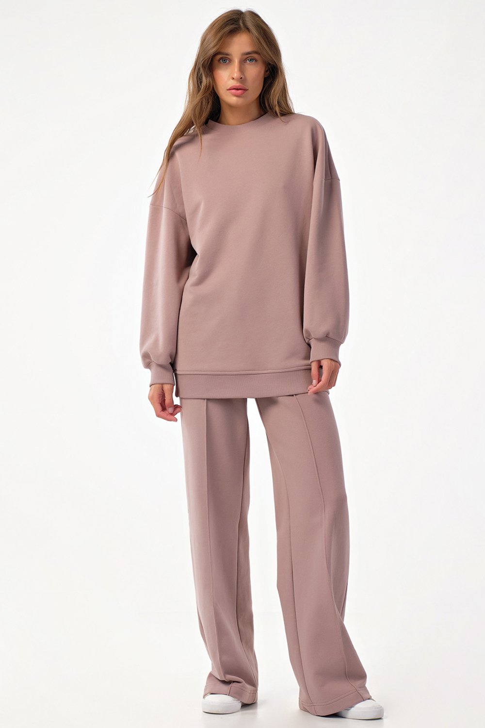 • Особенности: Костюм из свитшота и брюк из футера. Детали свитшота: свободный силуэт, горловина с бейкой из кашкорсе, спущенная линия плеча, широкий рукав с притачной манжетой из кашкорсе по низу, притачная планка из кашкорсе. Детали брюк: прямой силуэт, притачной пояс из кашкорсе с резиной, застроченные стрелки по переду.