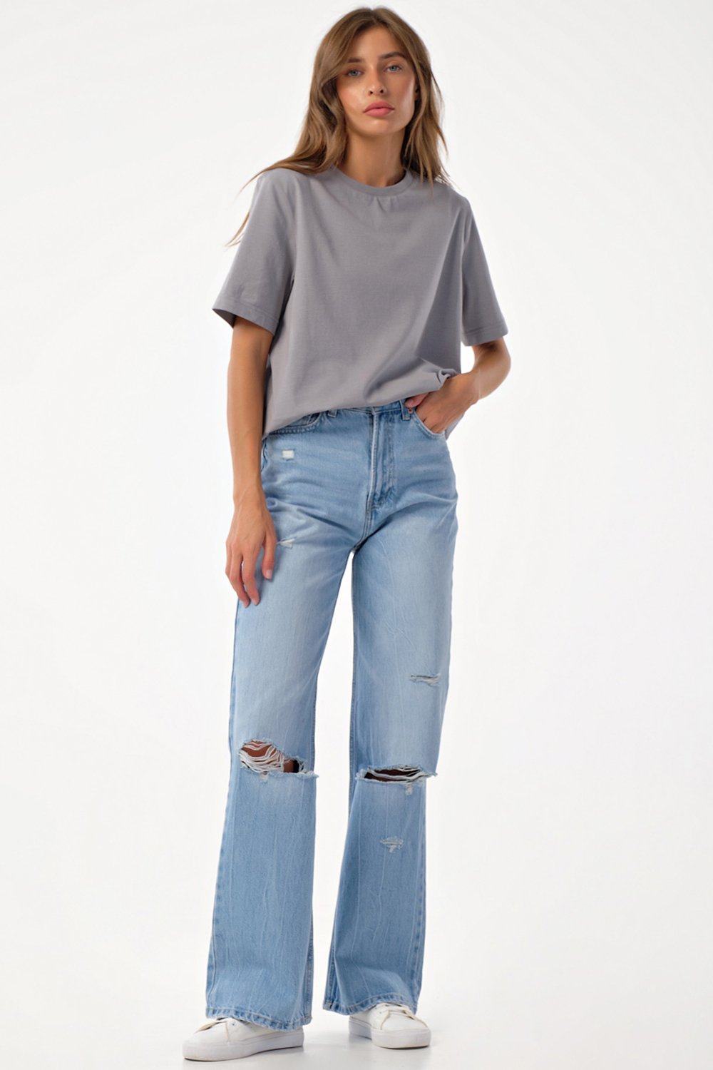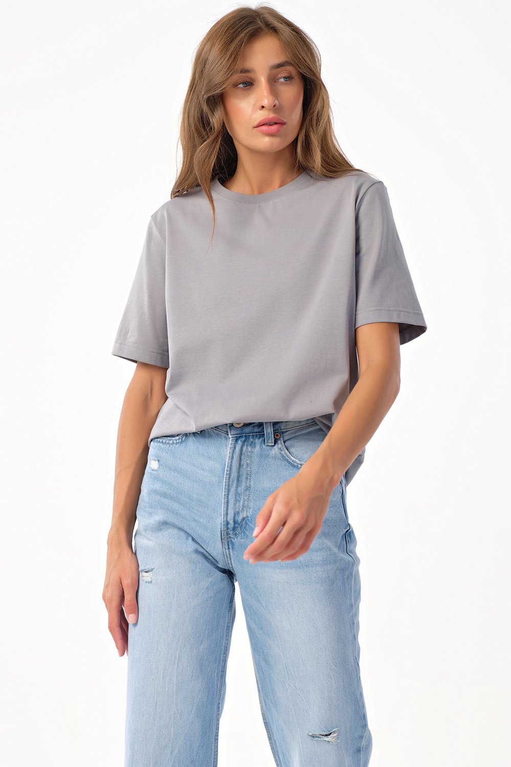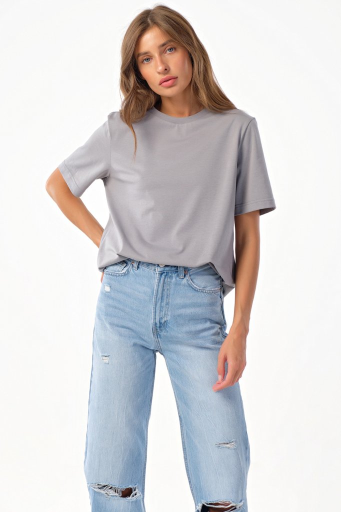 • Особенности: Футболка прямого силуэта среднего объема из трикотажа. Детали: горловина обработана бейкой.