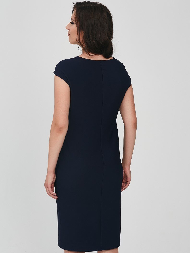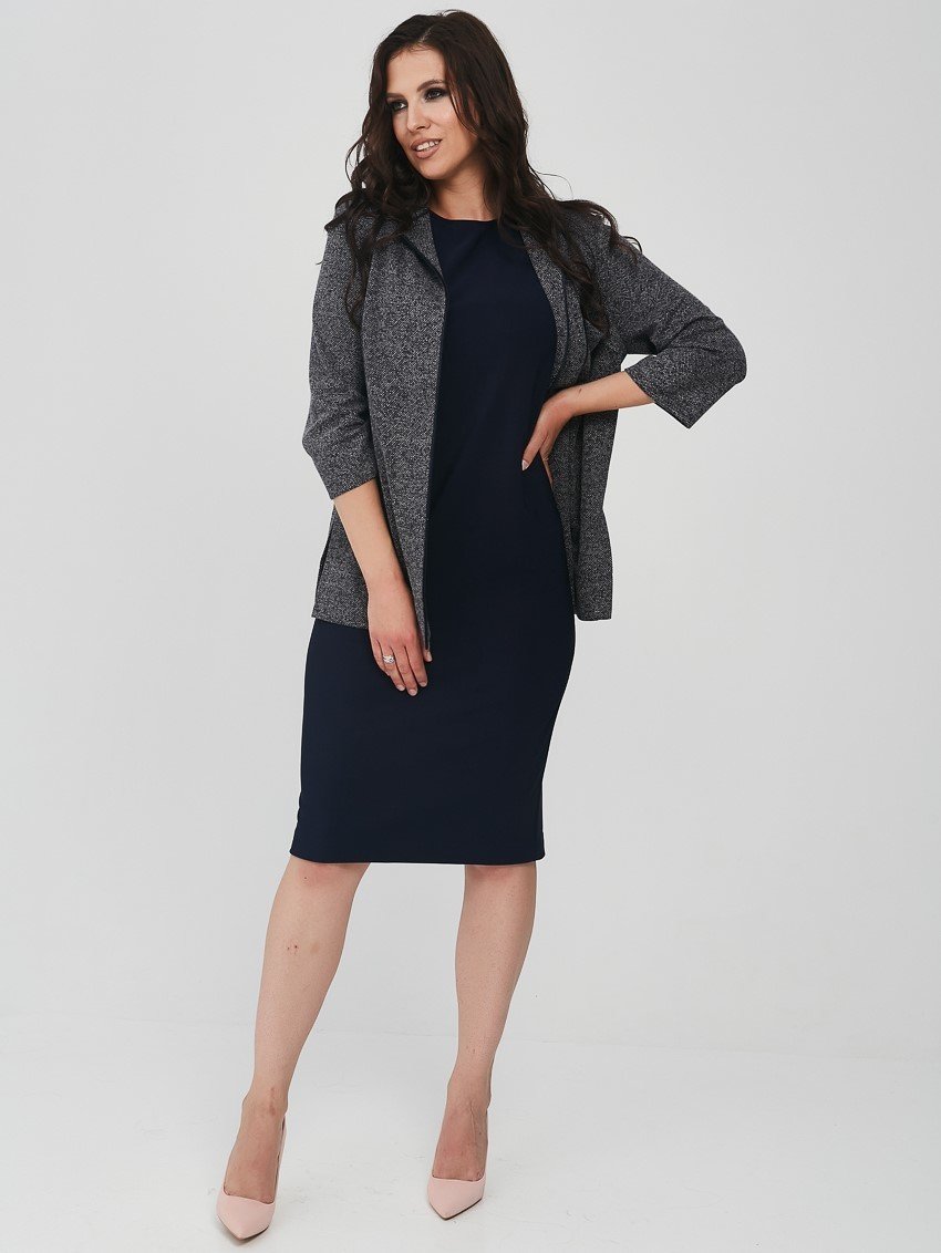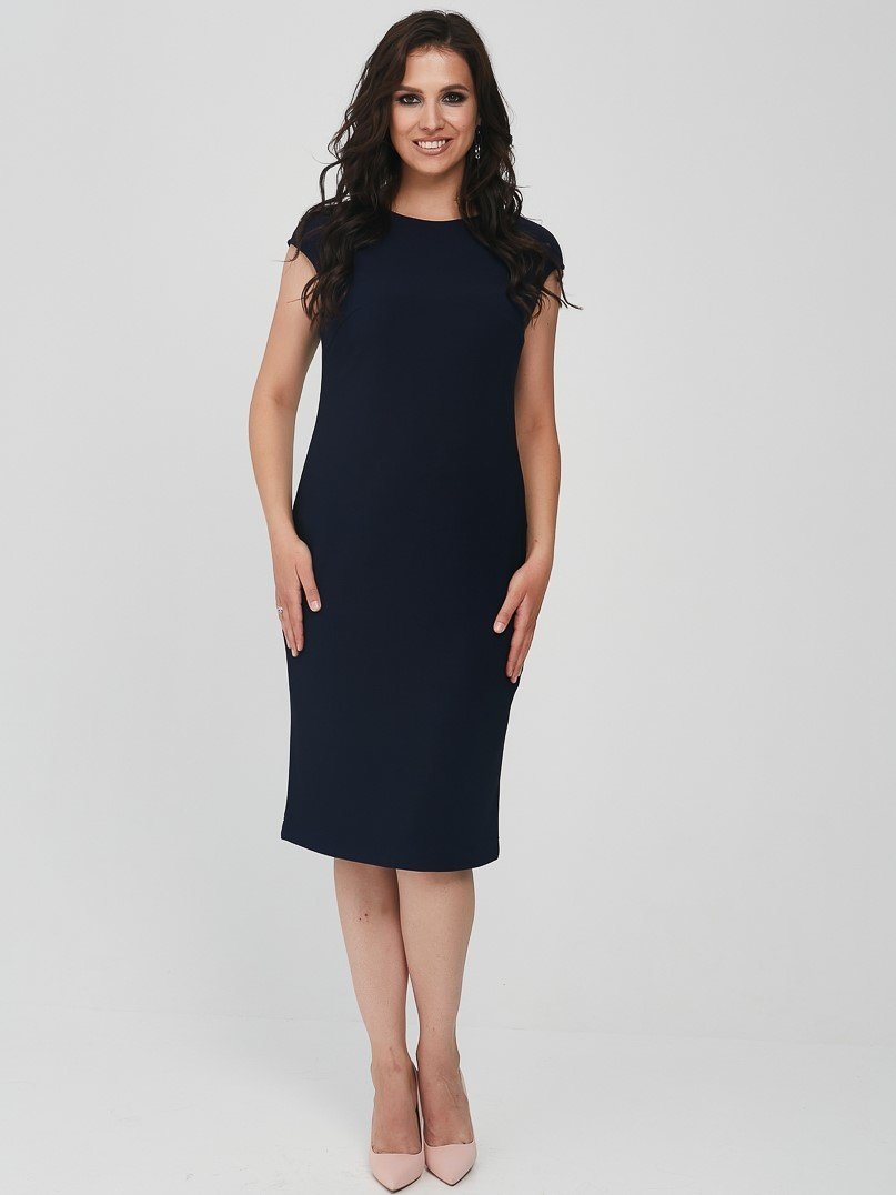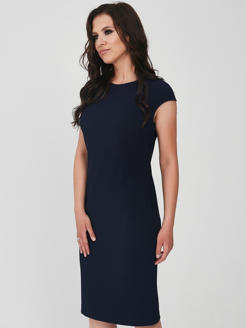 Платье женское, полуприлегающего силуэта. Спинка со средним швом, перед с нагрудными вытачками. Горловина круглая, плечо спущенное.Характеристики: