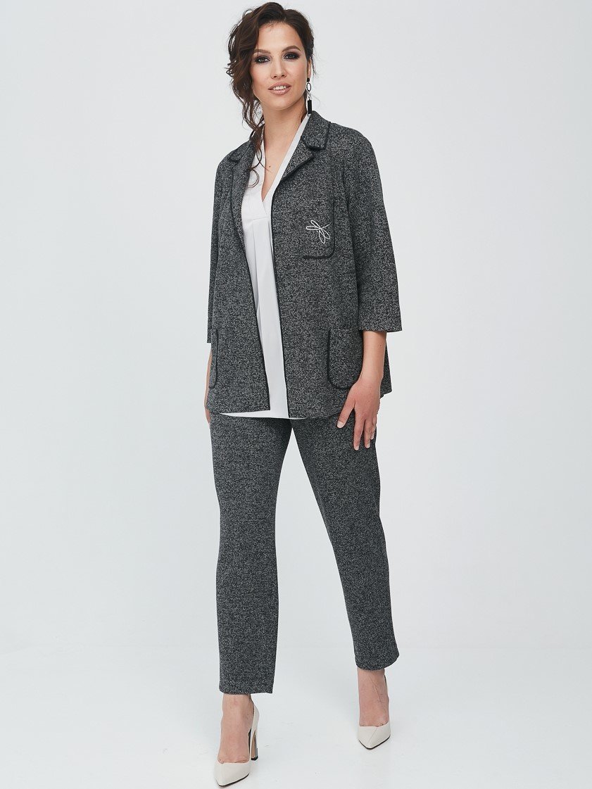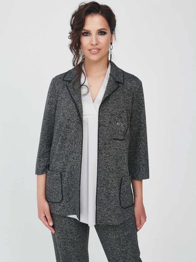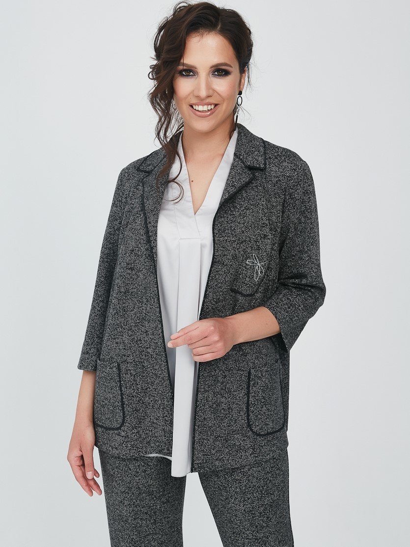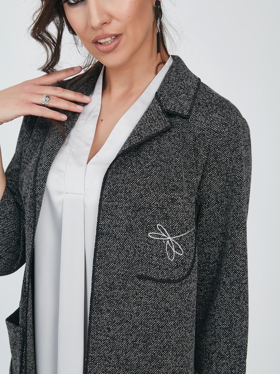 Жакет женский из трикотажного полотна букле, прямого силуэта, без застежки, с разрезами в боковом шве. Перед с тремя накладными карманами. На верхнем нагрудном кармане выполнена вышивка металлической нитью в форме стрекозы. Рукав втачной, 3/4. Борт прямой, воротник отложной с острыми концами. Край борта, воротник и карманы обработаны декоративной строчкой.