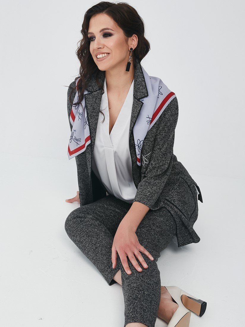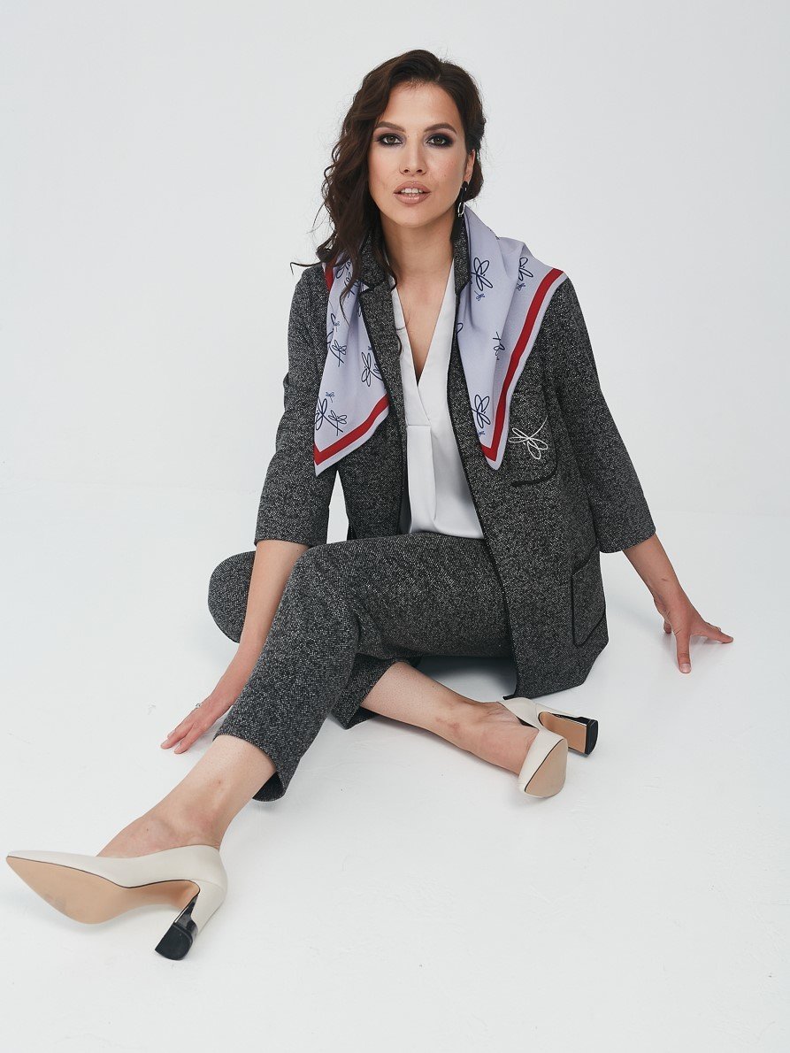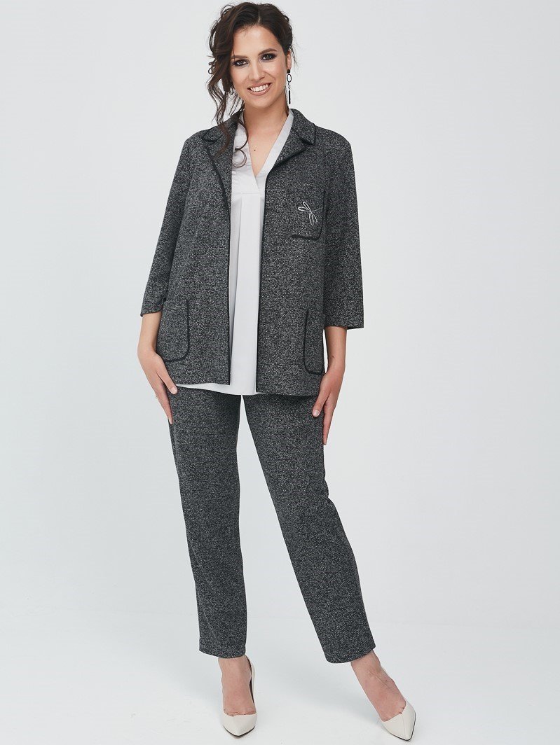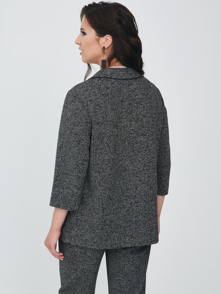 Жакет женский из трикотажного полотна букле, прямого силуэта, без застежки, с разрезами в боковом шве. Перед с тремя накладными карманами. На верхнем нагрудном кармане выполнена вышивка металлической нитью в форме стрекозы. Рукав втачной, 3/4. Борт прямой, воротник отложной с острыми концами. Край борта, воротник и карманы обработаны декоративной строчкой.
