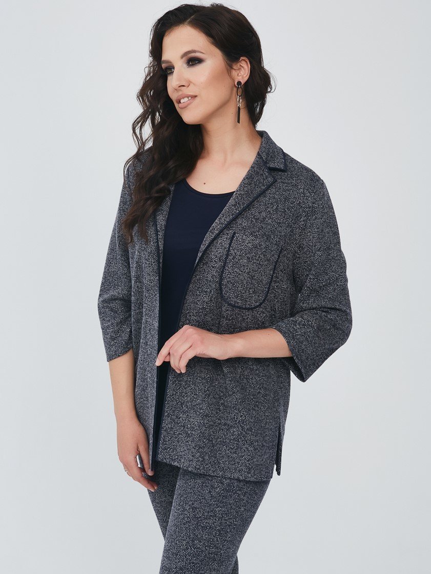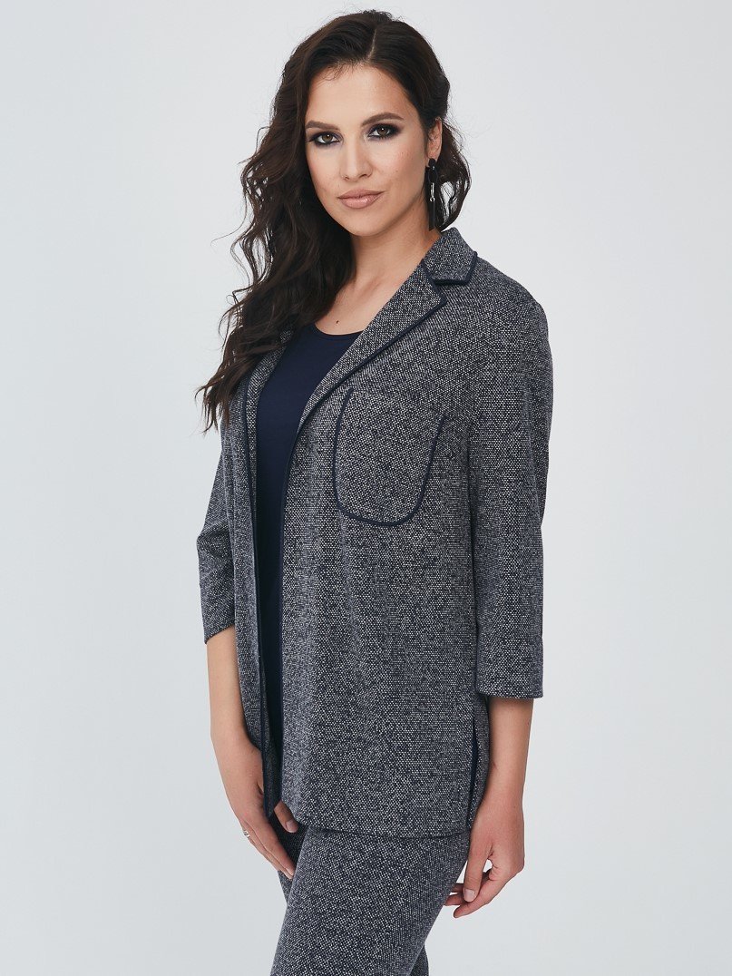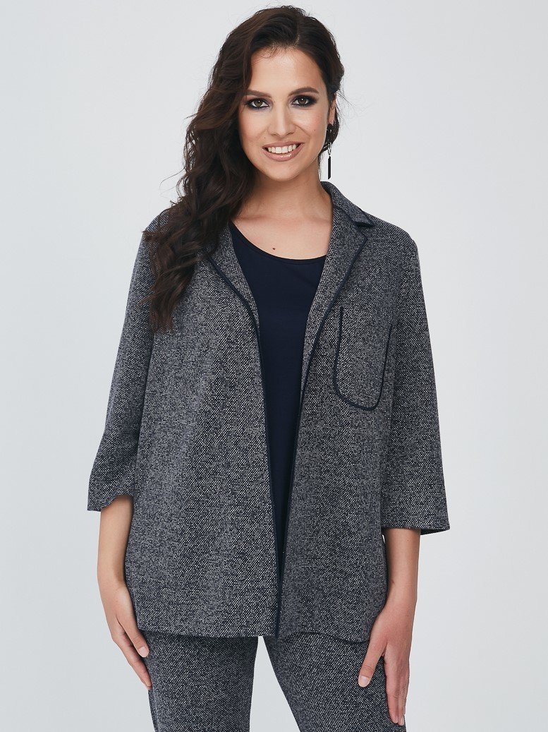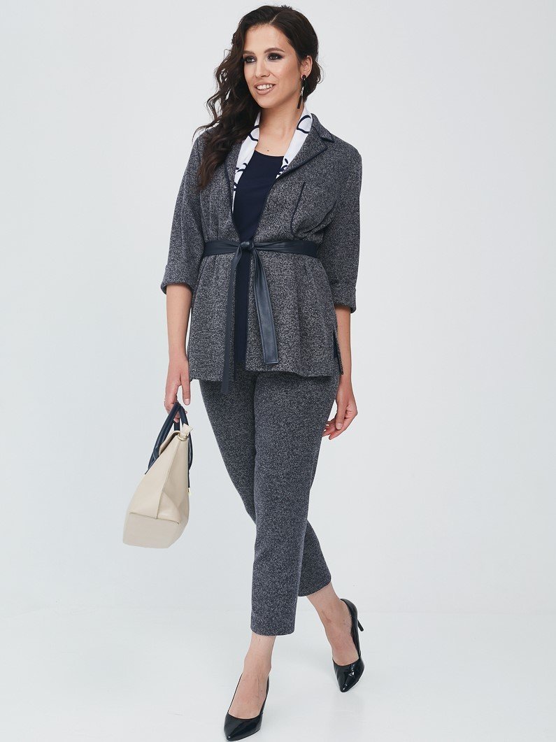 Жакет женский из трикотажного полотна букле, прямого силуэта, без застежки, с разрезами в боковом шве. Перед с одним нагрудным карманом. Рукав втачной, 3/4. Борт прямой, воротник отложной с острыми концами. К жакету прилагается пояс из искусственной кожи. Край борта, воротник и карманы обработаны декоративной строчкой.Характеристики: