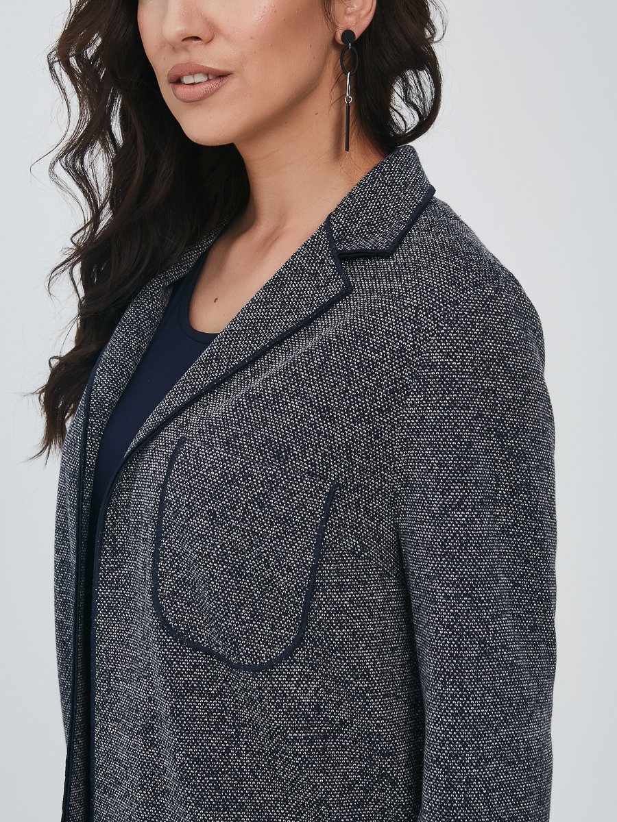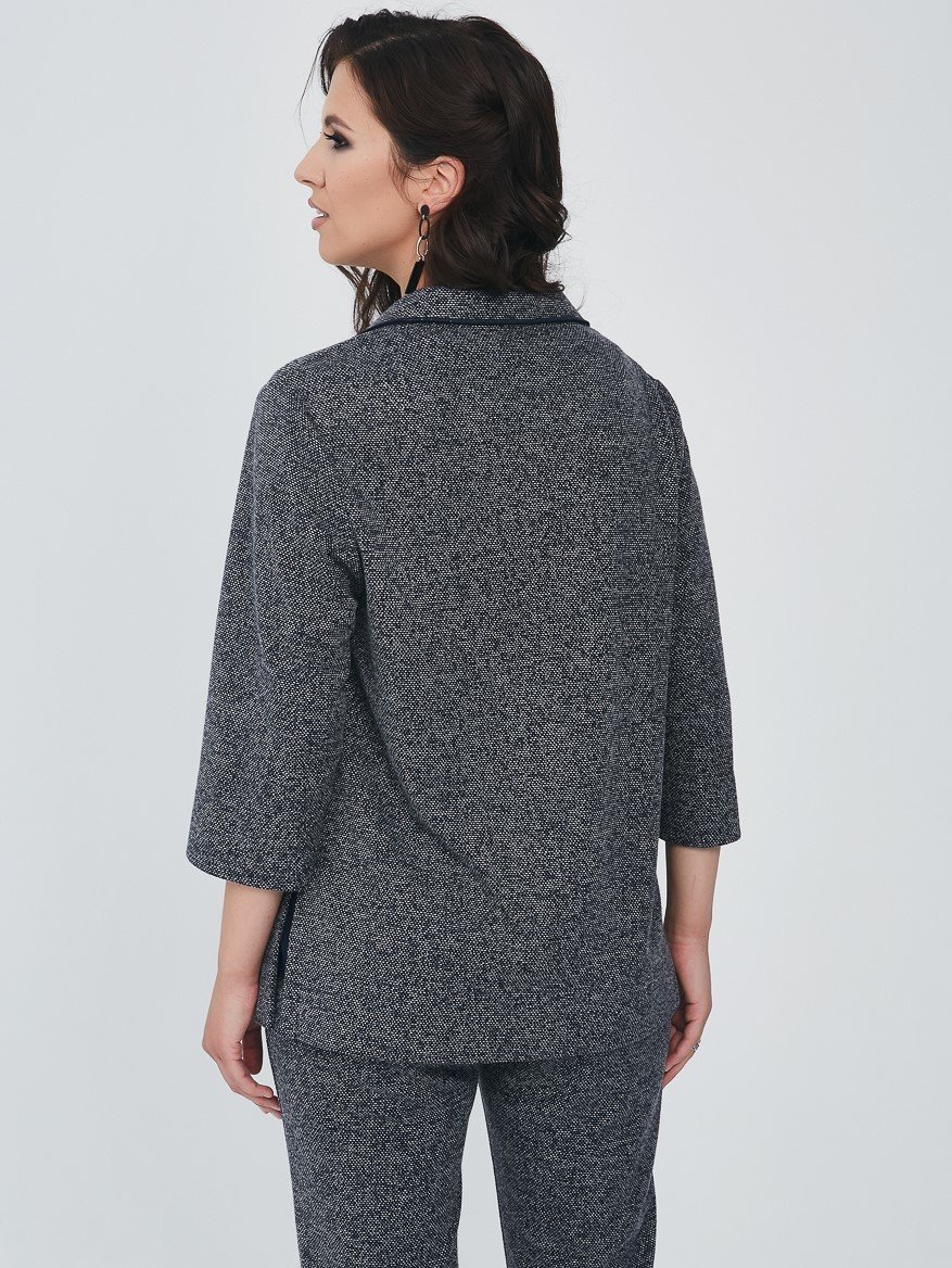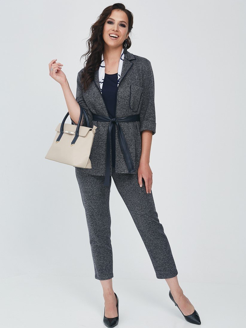 Жакет женский из трикотажного полотна букле, прямого силуэта, без застежки, с разрезами в боковом шве. Перед с одним нагрудным карманом. Рукав втачной, 3/4. Борт прямой, воротник отложной с острыми концами. К жакету прилагается пояс из искусственной кожи. Край борта, воротник и карманы обработаны декоративной строчкой.Характеристики: