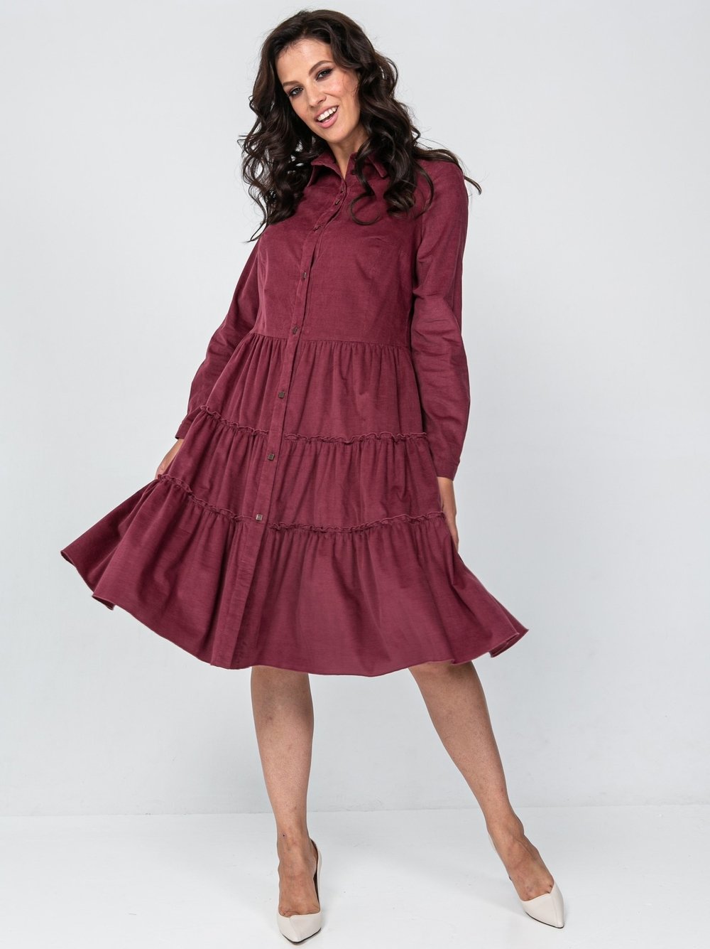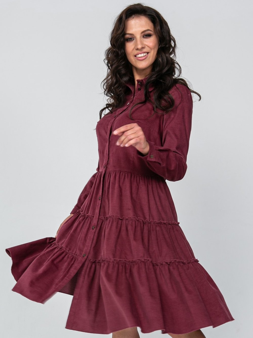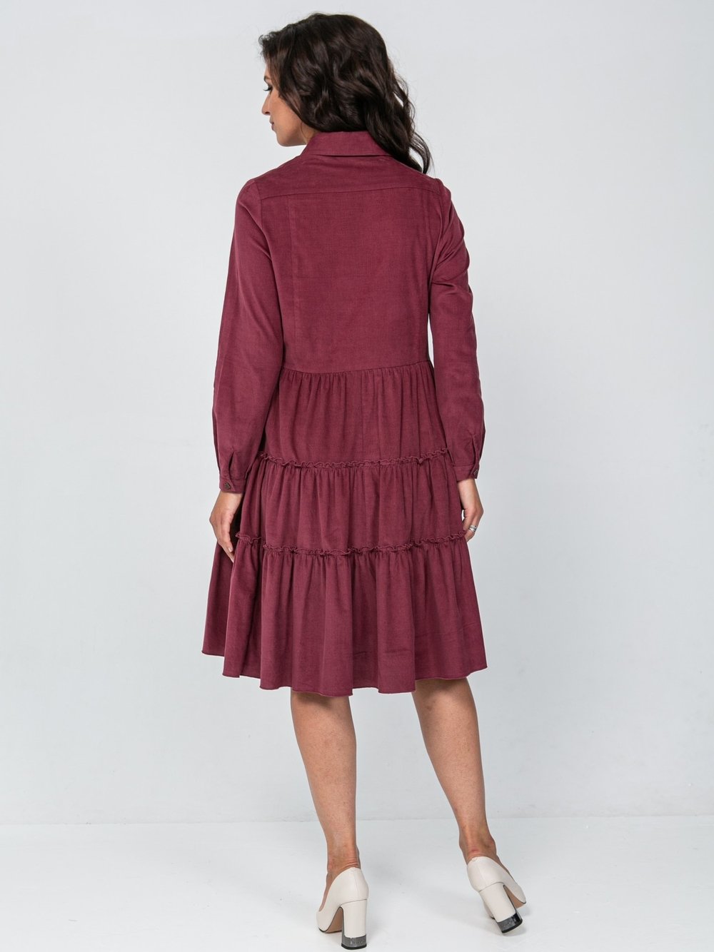 Платье женское из хлопчатобумажного микровельвета, трапециевидного силуэта, отрезное по линии талии. Нижняя часть переда и спинки из трех воланов, собранных в сборку. Верхняя часть спинки с кокеткой. Перед по центру с притачной планкой, застегивающейся на петли и пуговицы. Рукав втачной, длинный, по низу на притачной манжете, застегивающейся на петлю и пуговицу. Платье без подкладки.Характеристики: