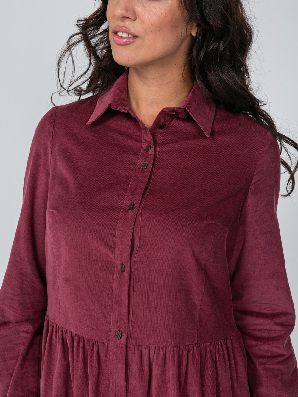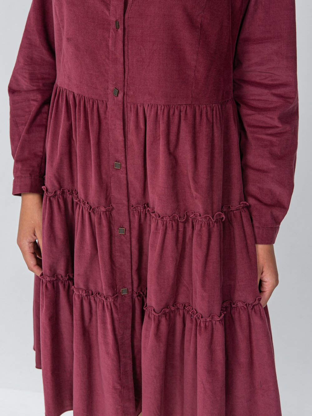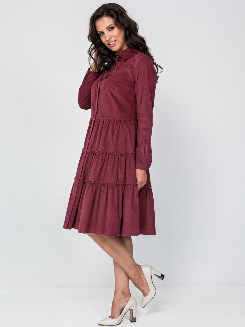 Платье женское из хлопчатобумажного микровельвета, трапециевидного силуэта, отрезное по линии талии. Нижняя часть переда и спинки из трех воланов, собранных в сборку. Верхняя часть спинки с кокеткой. Перед по центру с притачной планкой, застегивающейся на петли и пуговицы. Рукав втачной, длинный, по низу на притачной манжете, застегивающейся на петлю и пуговицу. Платье без подкладки.Характеристики: