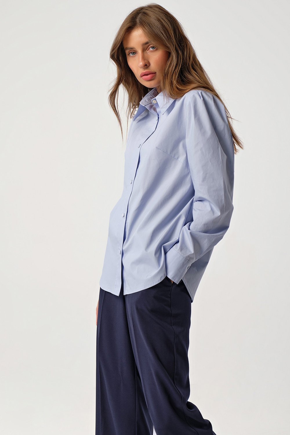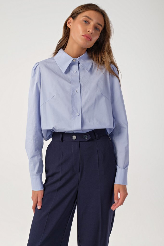 • Особенности: Рубашка прямого силуэта из сорочечной ткани. Детали: отложной воротник со стойкой, втачной рукав со складками по окату, притачная манжета с застежкой на пуговицы, кокетка по спинке, планка по переду с застежкой на петли-пуговицы.