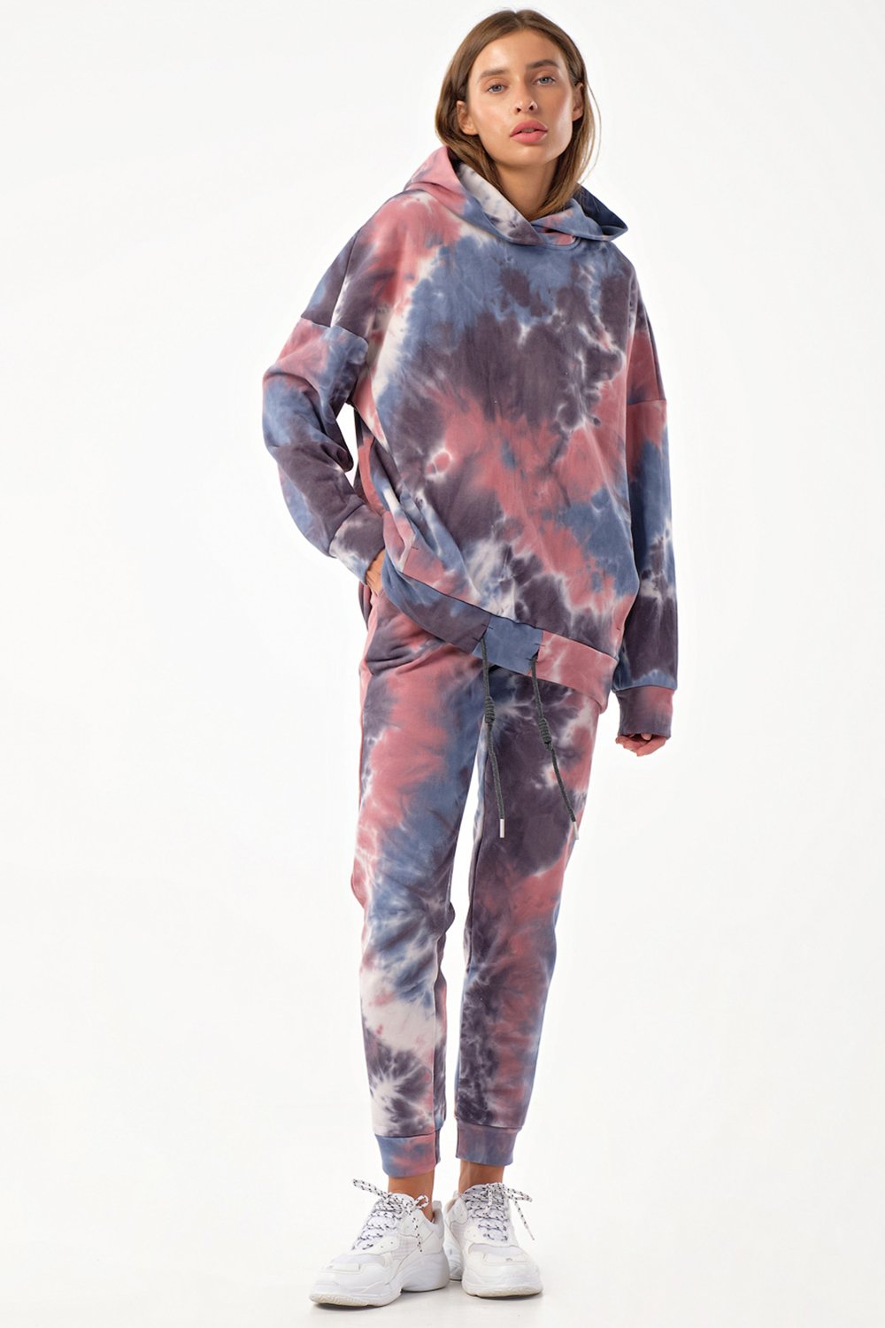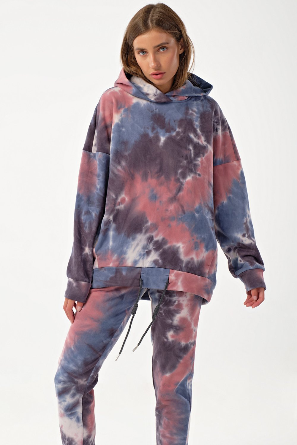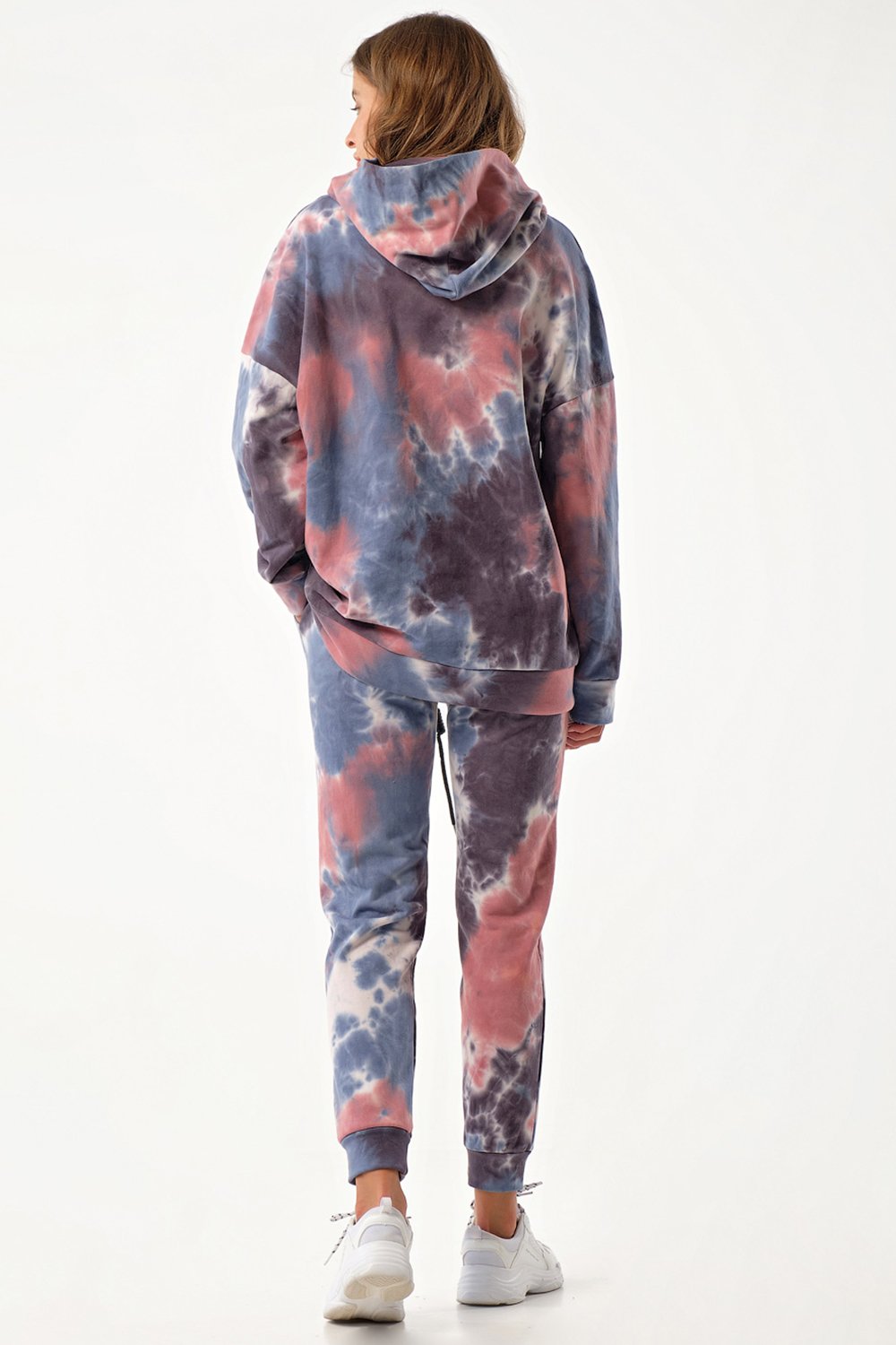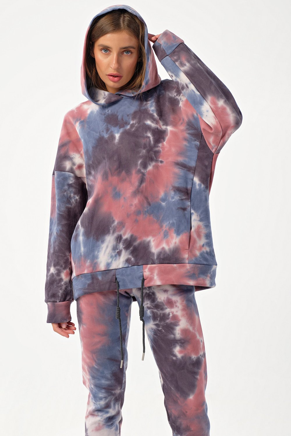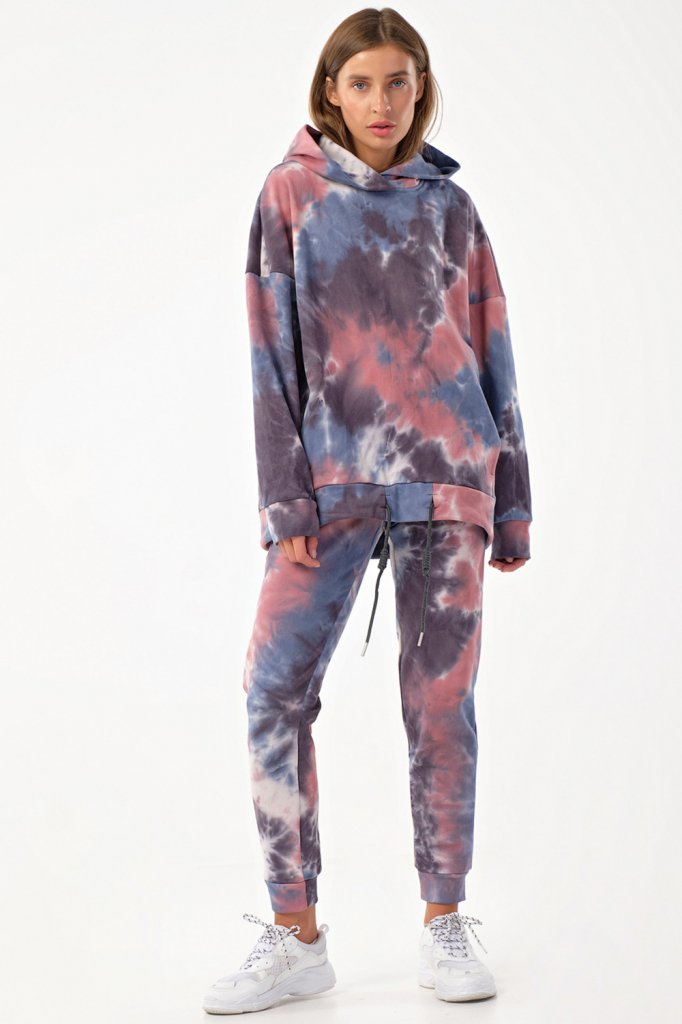 • Особенности: Костюм из свитшота и брюк из футера "тай-дай". Детали свитшота: свободный силуэт, капюшон, спущенная линия плеча, рукав с притачной манжетой по низ, у притачная планка с кулиской и декоративным шнуром. Детали брюк: полуприлегающий силуэт, притачной пояс на резинке, боковые карманы, притачные манжеты по низу брюк.