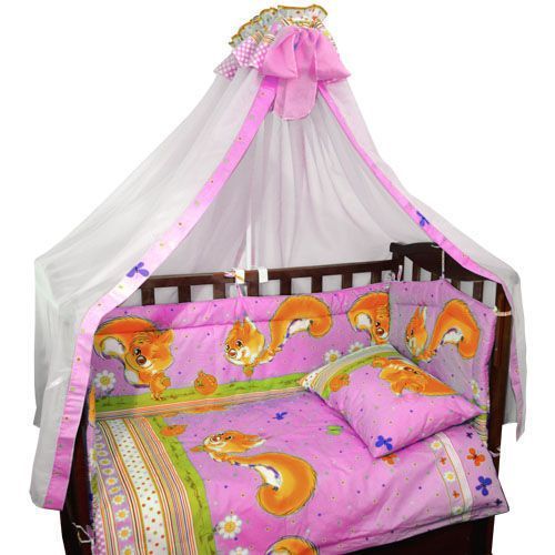 • комплект состоит из 7 предметов: бортик с 4-х сторон, балдахин-вуаль, одеяло, пододеяльник, простынь на резинке, наволочка, подушка;