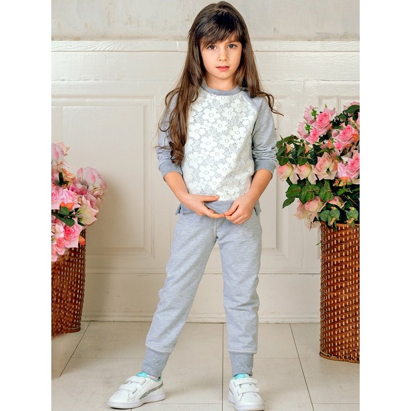 Костюм состоит из джемпера и штанишек. Ткань комплекта петлевой футер с содержанием лайкры. Полочка джемпера продублирована гипюром.